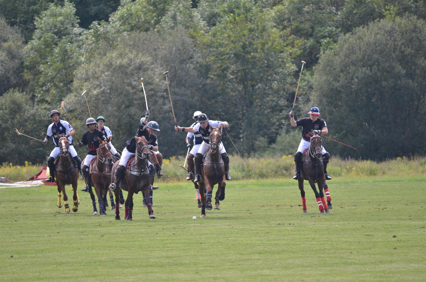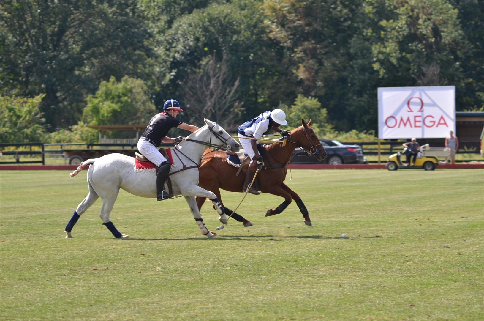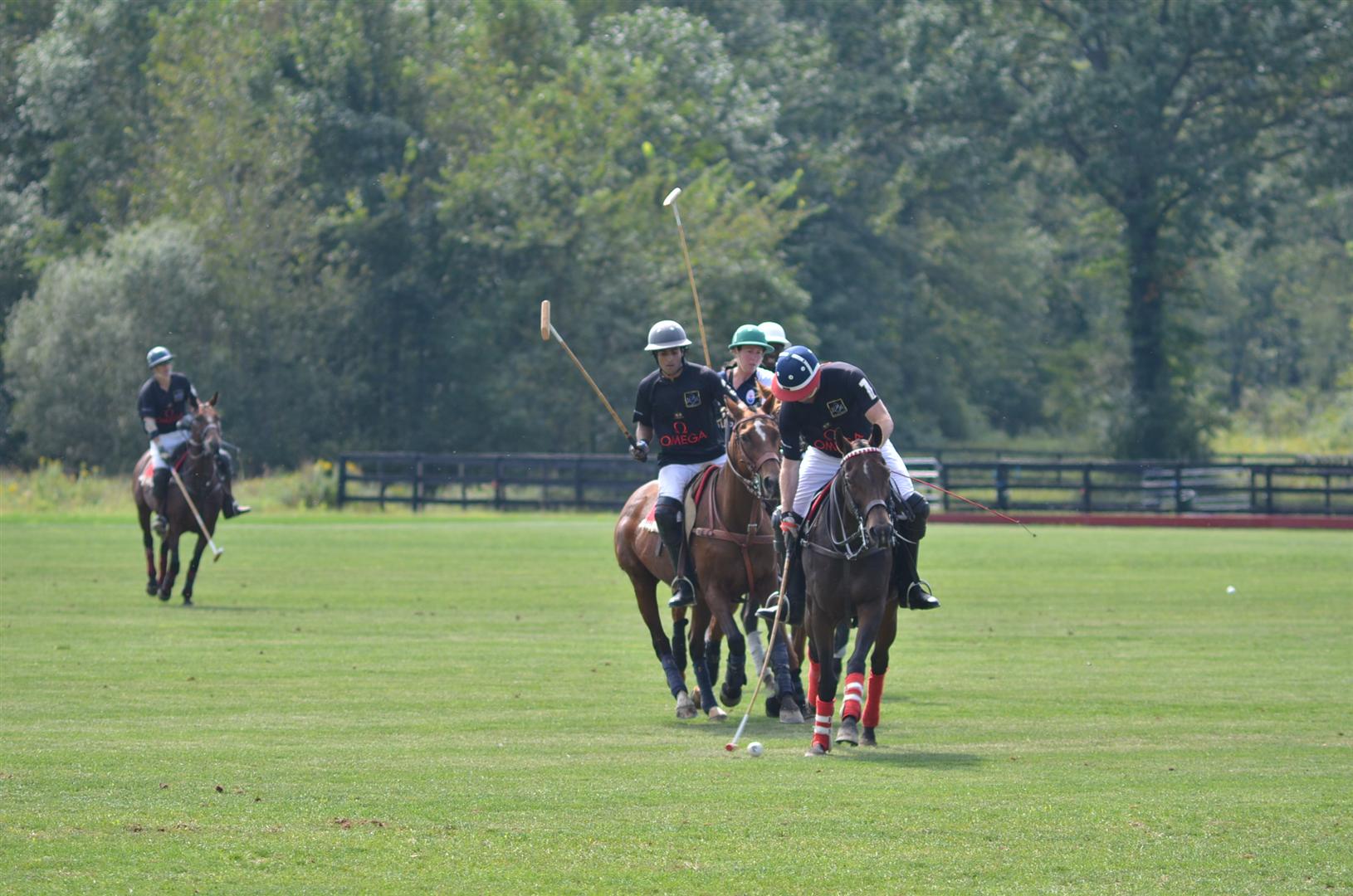 Omar Mangalji of Omega Watches in control of the ball, shadowed by Maserati USA players